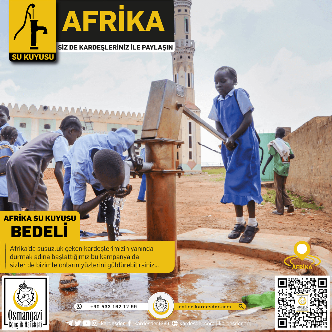 Afrika’da binlerce Müslüman temiz suya kavuşmayı bekliyor. Binlerce Müslüman çocuk da çamurlu su içiyor. Üstelik bu kirli sular tifo dizanteri gibi çocuk ölümlerine sebebiyet veren amansız hastalıklara neden oluyor. Onlara temiz su ikram etmek bir nevi çocuklar için hayat bahşetmek gibi. Çocuk ölümlerinin azalmasına yardımcı olduğunuz için de ecir alırsınız.