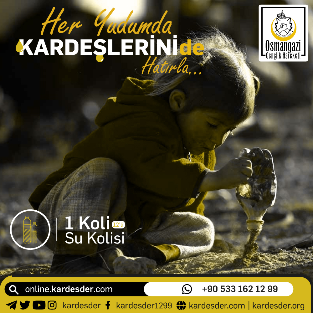 Suriye’de su kaynakları ve barajlardan su temini yok denecek adar az. Bombardıman ve kimyasallar Suriye’de direnen Müslümanların can su damarlarını kesmiş durumda. Mevcut su yoğun olarak kireçli ve hastalıklara neden oluyor. Mazlum coğrafyanın su ihtiyacını giderebilmek adına bir pet şişe su da olsa az çok demeden katkıda bulunmak isterseniz bize WhatsApp numaralarımızdan ulaşabilir, aşağıdaki hesaplarımızdan bağışta bulunabilirsiniz.