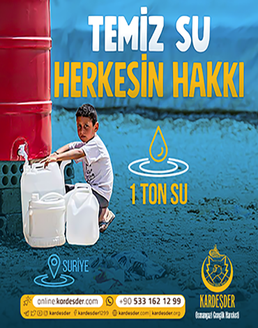 Suriye’de su kaynakları ve barajlardan su temini yok denecek kadar az. Bombardıman ve kimyasallar Suriye’de direnen Müslümanların can su damarlarını kesmiş durumda. Mevcut su yoğun olarak kireçli ve hastalıklara neden oluyor. Mazlum coğrafyanın su ihtiyacını giderebilmek adına bir pet şişe su da olsa az çok demeden katkıda bulunmak isterseniz bize WhatsApp numaralarımızdan ulaşabilir, aşağıdaki hesaplarımızdan bağışta bulunabilirsiniz.