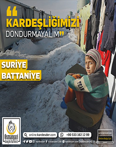 Bombardımanından kurtulan mazlumların ne kalacak bir evleri var ne de bir çadırları. Zeytinlik arazilerde ağaçlar arasında naylon ve çarşafları gererek soğuktan korunmaya çalışıyorlar. Sertleşmeye başlayan hava insanların sağlığını tehdit etmeye başladı. Gece çocuklarını örtecek battaniyeleri yok. Isınmak için yakacak kömürleri yok. Kömürü yakacak sobaları yok. Sobayı kuracak çadırları dahi yok. Onların sadece Allah’a tevekkülü, yardım edecek kardeşleri var. Haydi Allah için siz de yardım elinizi uzatın. Hayırda geç kalmayın. Vatanlarını terk etmeyen ve kar değil bombalar yağarken dahi topraklarında kalmaya direnen bu onurlu insanların yardımınıza ihtiyacı var.